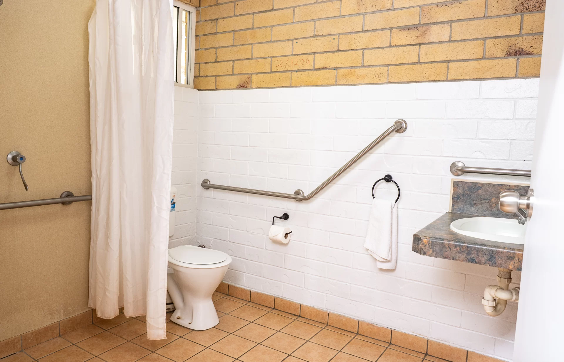 - Accessible bathroom with handrails and walk-in shower
