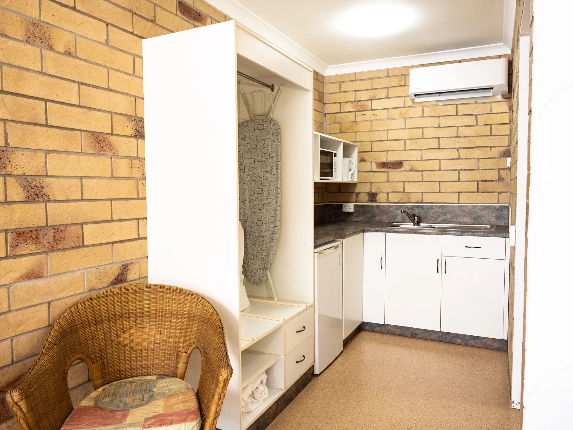 - Kitchenette with microwave, toaster, kettle, sink and fridge